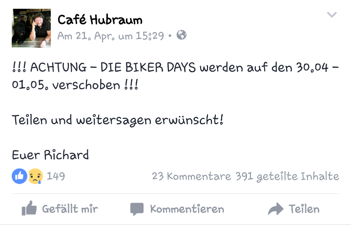 Schade, dann sehen wir uns hoffentlich am 4. Juni beim Biker4Kids.
