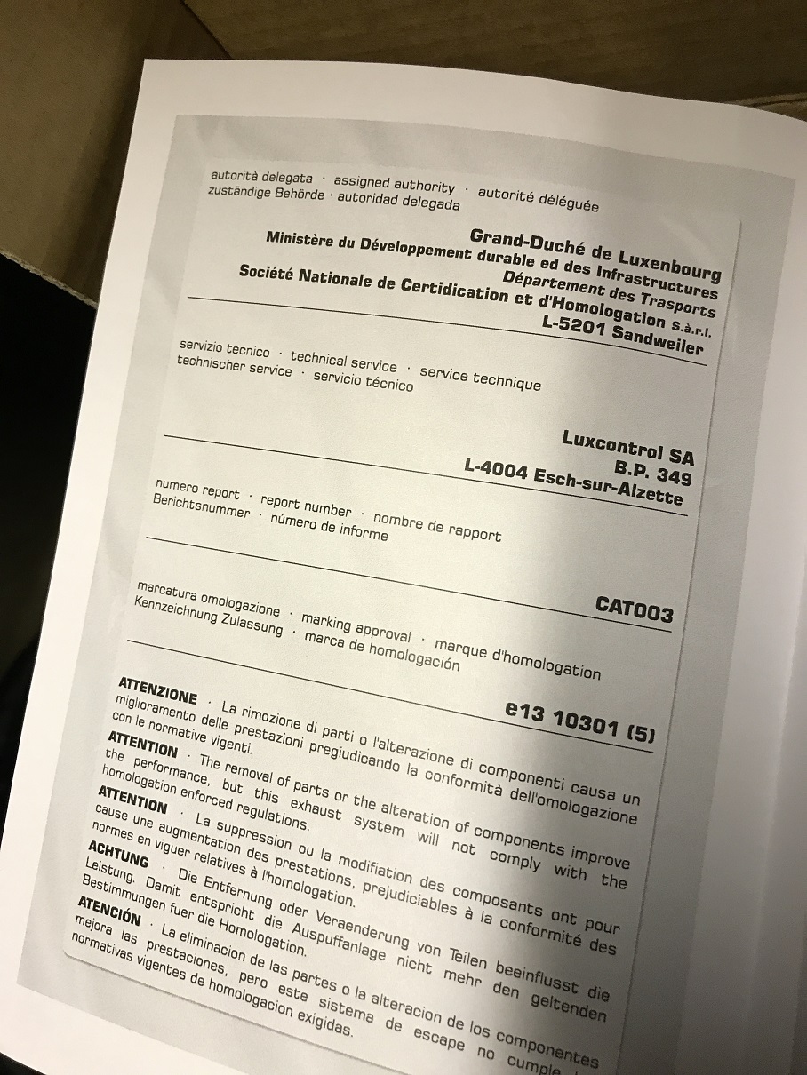 Verarbeitung (soweit ich das beurteilen kann) und Papiere für die Auspuffanlage scheinen soweit in Ordnung.