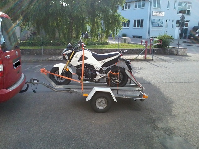So und ich hab mal getestet, wie ich meine Kleine am Besten auf dem Hänger verzurre, denn nächsten Monat gehts in den Süden, besser gesagt nach Kärnten, Millstätter See :)