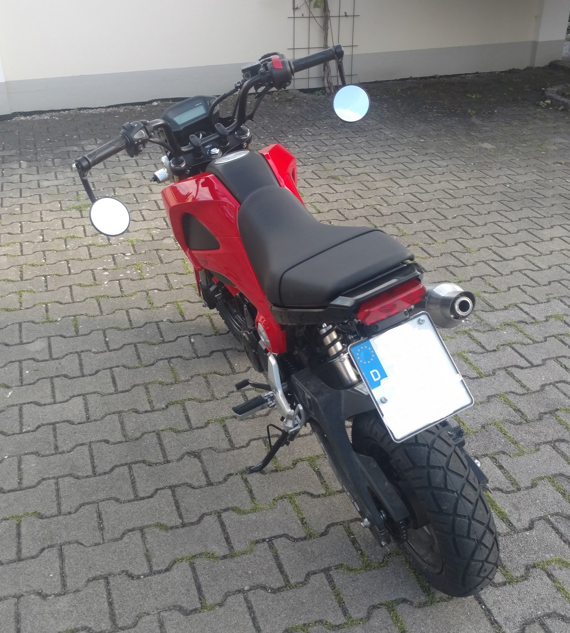 Wegen des Ori KZH habe ich noch das große Nummernschild, was jetzt in einem "illegalen 45°-Winkel angebracht wurde, da ich zu viel Schiss hab, dass das Nummernschild während der Fahrt gegen den Reifen schlägt. Wenn noch Geld übrig ist, lasse ich mir ein neues, kleines Kennzeichen bestempeln.