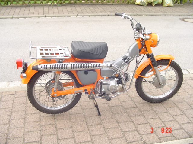 Heute ca 40 km gefahren, macht weiterhin Spaß, Schaltvergnügen wie beim 108er Nice Motor, hat jedoch irgendwie mehr Kraft auch am Berg. Bedingt durch die kleineren Reifen 12 Zoll statt 17 Zoll ist die Endgeschwindigkeit gleich hoch so um die 95 km/h. Was aber völlig ausreicht. Im Gegensatz zu 125er China Motoren liegen Welten, mein Zong bzw. Skyteammotoren sind dagegen eher ruppig, von Schaltfreude gar nicht zu reden, geht beim Zong der Leerlauf noch einigermaßen rein, will der Skyteammotor erst ausgemacht werden um den Leerlauf zu finden. Jetzt hab ich bei den 125er nur noch die Auswahl zwischen Zong schwarz, Zong silber und MSX Motor, die anderen CT 90/110 bekommen orginal Motoren rein, mal schauen wie der Vergleich 90 ccm max 8gang zu 125 ccm 4gang ist. Die Mokicks lasse ich außen vor.