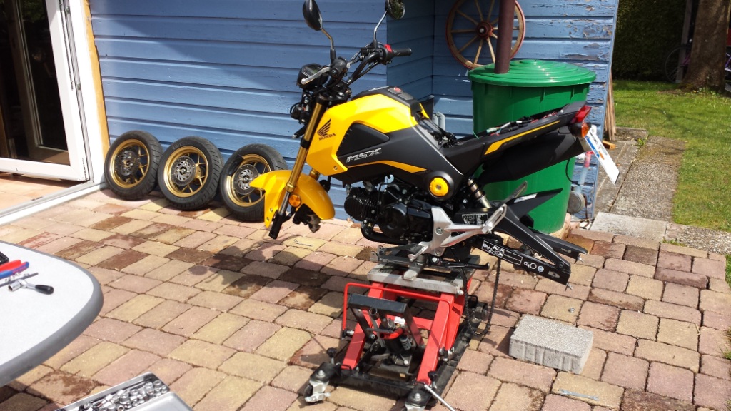 Funktioniert prima, damit kann ich problemlos sowohl das Vorderrad wechseln, als auch die Hinterachse und Schwinge ausbauen.